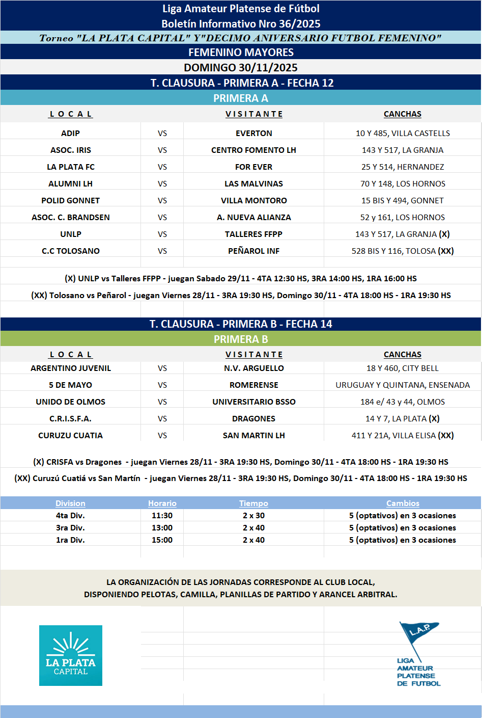 #Femenino T.CLAUSURA 2025 –- Primera A – Fecha 12 | Primera B Fecha 14 – MAYORES