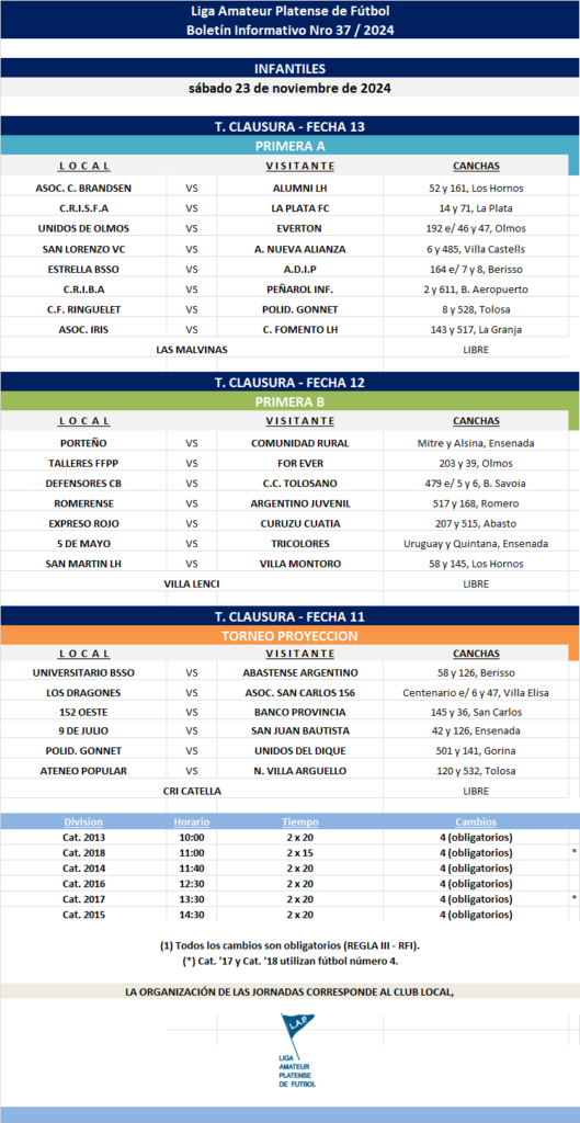 Masculino T. CLAUSURA 2024 – Primera A – FECHA 13 | PRIMERA B – FECHA 12 | T.PROYECCIÓN – FECHA 11 INFANTILES Y MAYORES