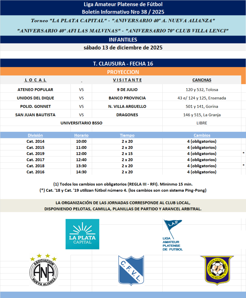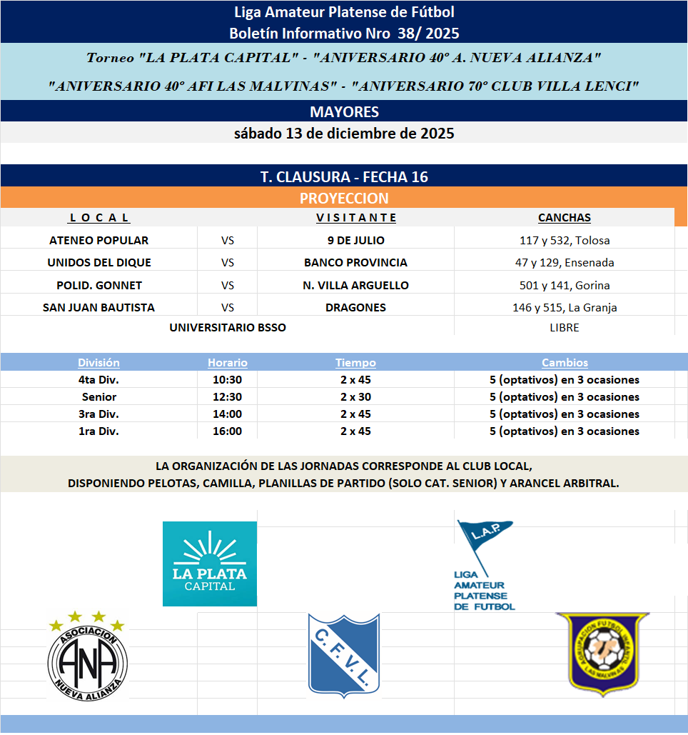 PROGRAMACIÓN NRO 38 – 2025: T. CLAUSURA LA PLATA CAPITAL – ANIVERSARIO 40 NUEVA ALIANZA – ANIVERSARIO 70 VILLA LENCI – ANIVERSARIO 40 LAS MALVINAS