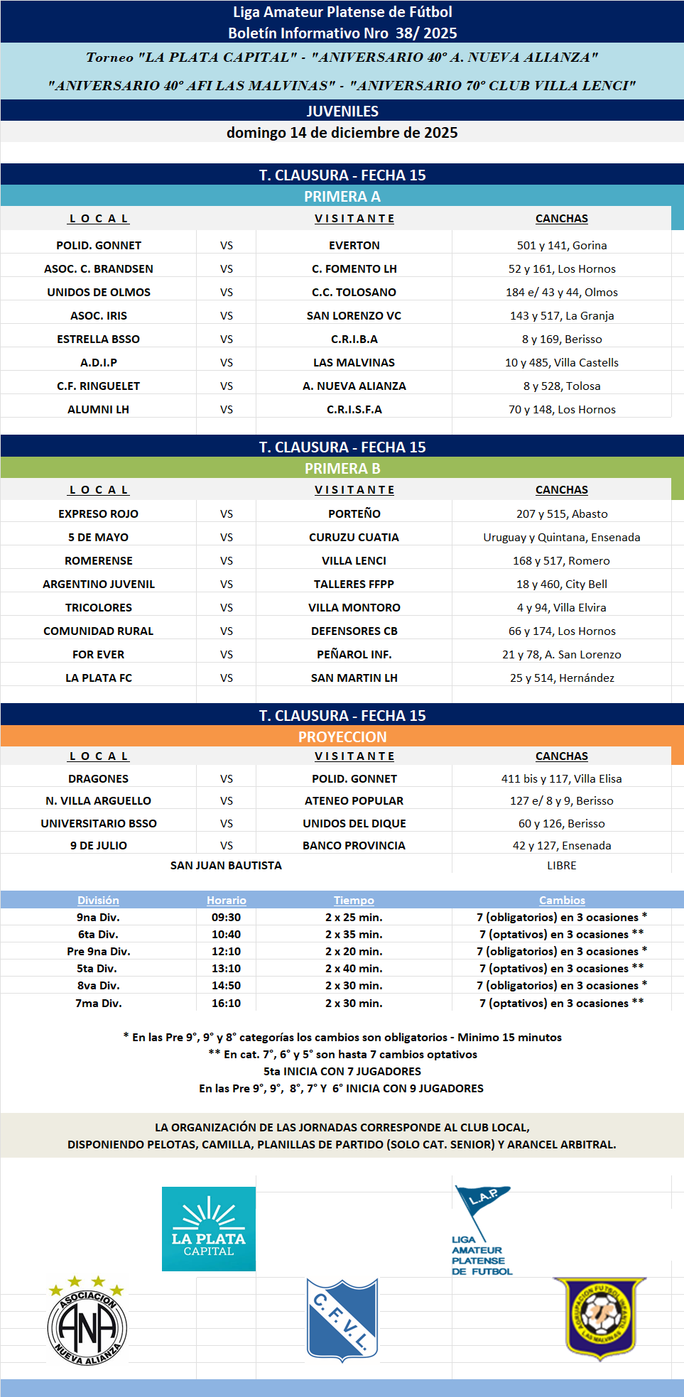 #Masculino T. CLAUSURA LA PLATA CAPITAL – ANIVERSARIO 40 NUEVA ALIANZA – ANIVERSARIO 70 VILLA LENCI – ANIVERSARIO 40 LAS MALVINAS – Primera A | Primera B | T.PROYECCIÓN FECHA 15 JUVENILES