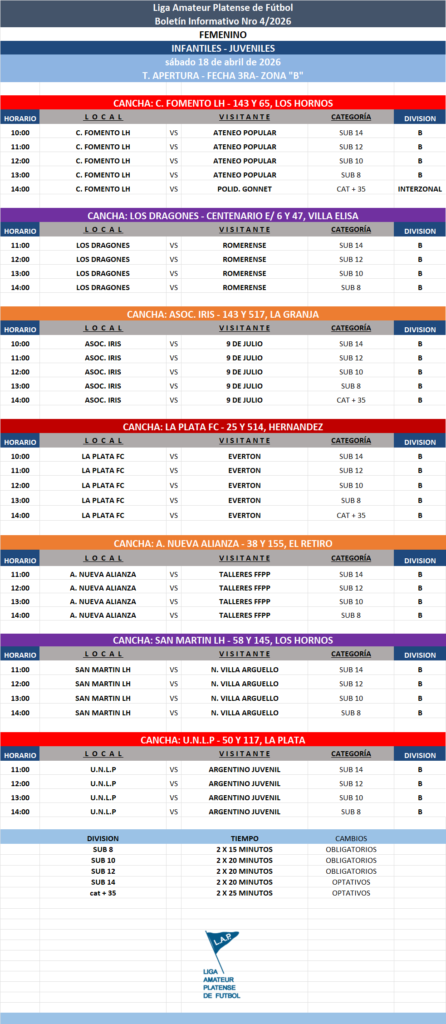 Compartimos el boletín informativo con la Programación Nro 4 a disputarse el próximo fin de semana según el siguiente cronograma: