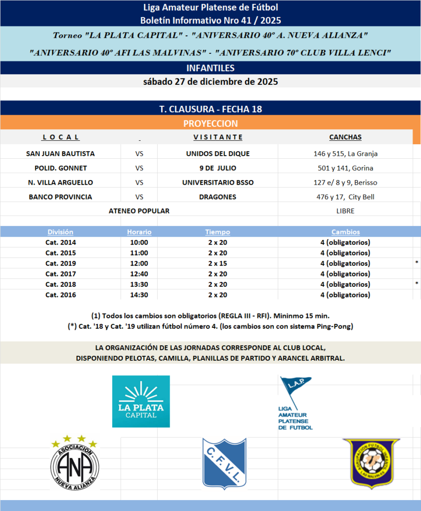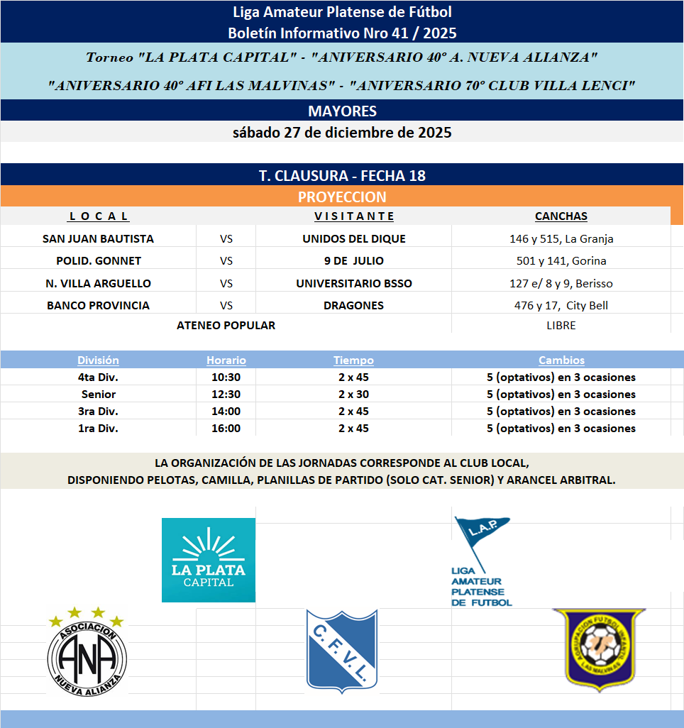 PROGRAMACIÓN NRO 41 – 2025: T. CLAUSURA LA PLATA CAPITAL – ANIVERSARIO 40 NUEVA ALIANZA – ANIVERSARIO 70 VILLA LENCI – ANIVERSARIO 40 LAS MALVINAS