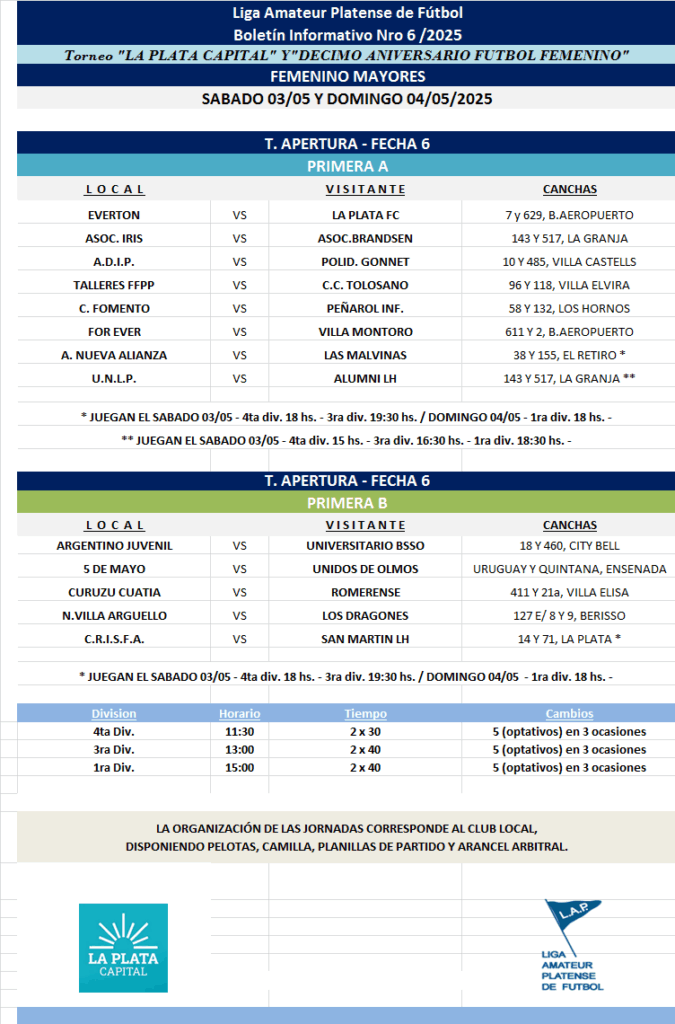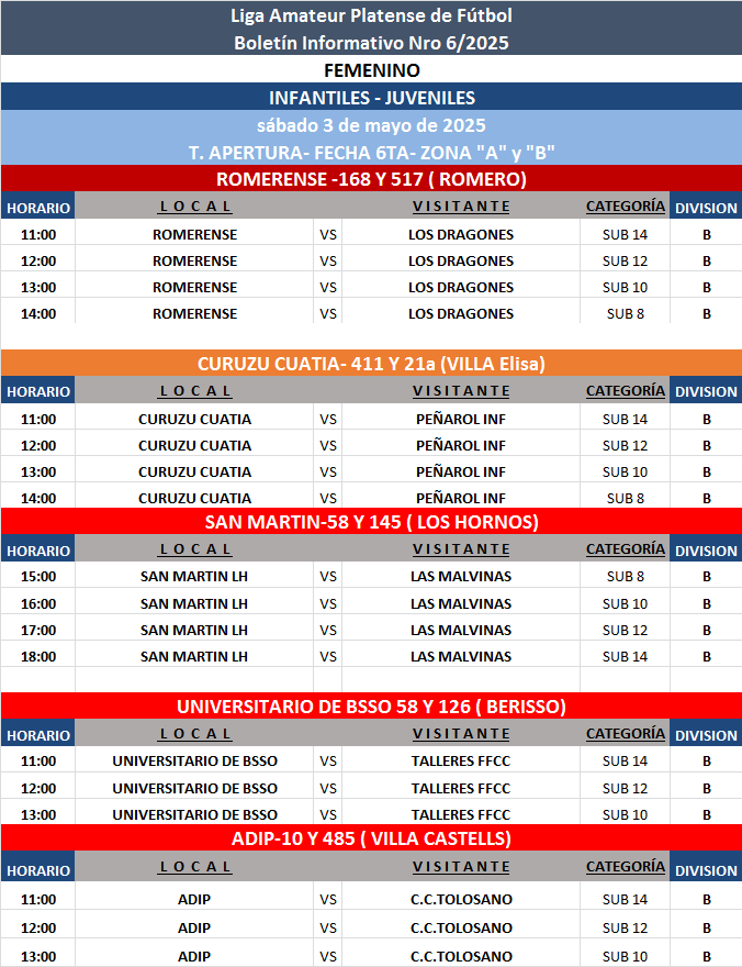Les comunicamos el boletín informativo con la programación N°6 a disputarse el próximo fin de semana según el siguiente cronograma: