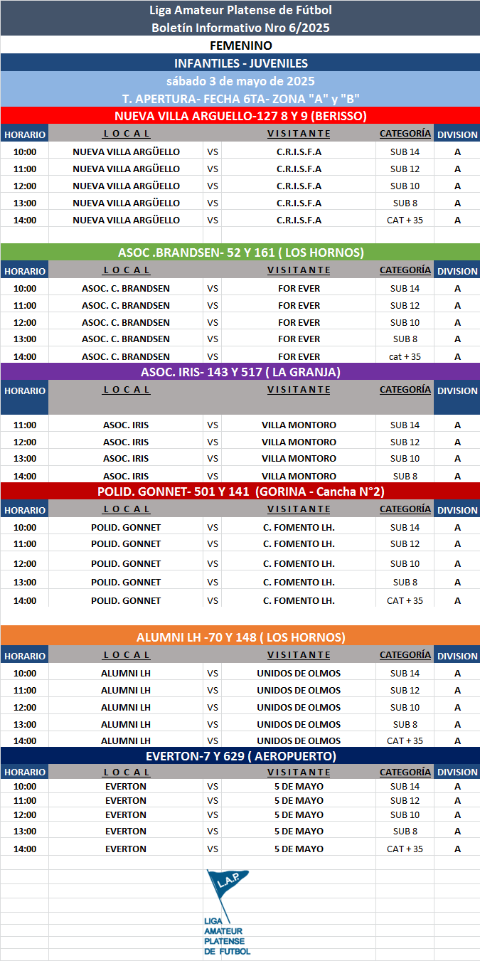 Les comunicamos el boletín informativo con la programación N°6 a disputarse el próximo fin de semana según el siguiente cronograma: