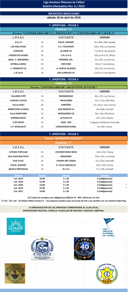 Compartimos el boletín informativo con la Programación Nro 6 a disputarse el próximo fin de semana según el siguiente cronograma: