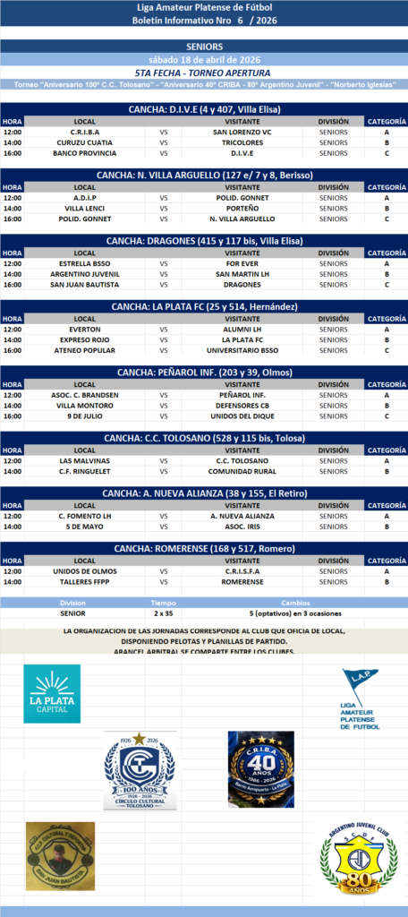 PROGRAMACIÓN NRO 6 – 2026: T. APERTURA LA PLATA CAPITAL – “ANIVERSARIO 100° C.C. TOLOSANO” -“ANIVERSARIO 40° C.R.I.B.A” – “ANIVERSARIO 80° ARGENTINO JUVENIL” – “NORBERTO IGLESIAS”