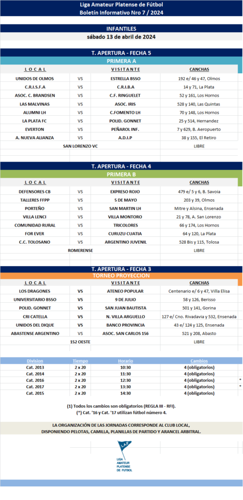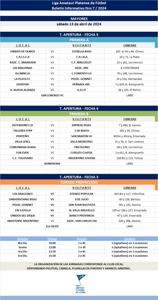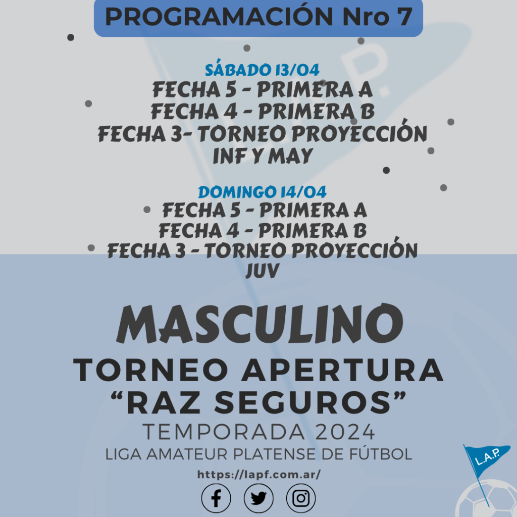 Les compartimos el boletín informativo con la programación Nro°7 a disputarse el próximo fin de semana según el siguiente cronograma: