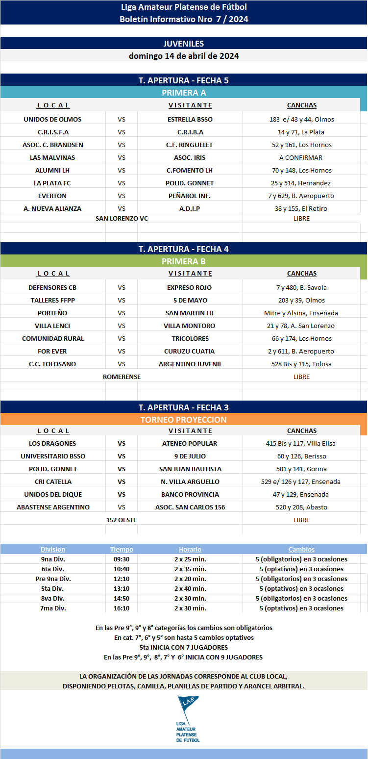 Les compartimos el boletín informativo con la programación Nro°7 a disputarse el próximo fin de semana según el siguiente cronograma: