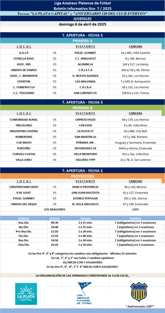 #Masculino T. APERTURA LA PLATA CAPITAL – ANIVERSARIO 120 CLUB EVERTON – Primera A | Primera B: FECHA 5 | T.Proyección – FECHA 2 MAYORES E INFANTILES