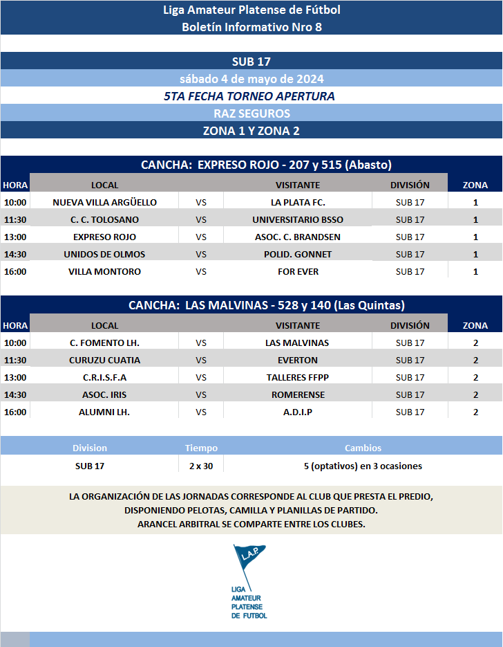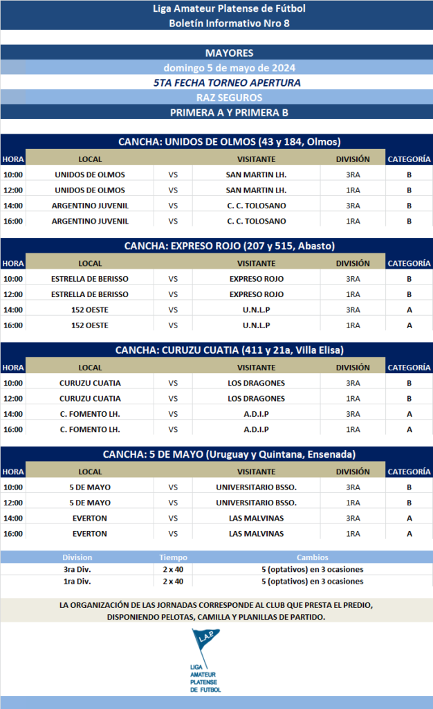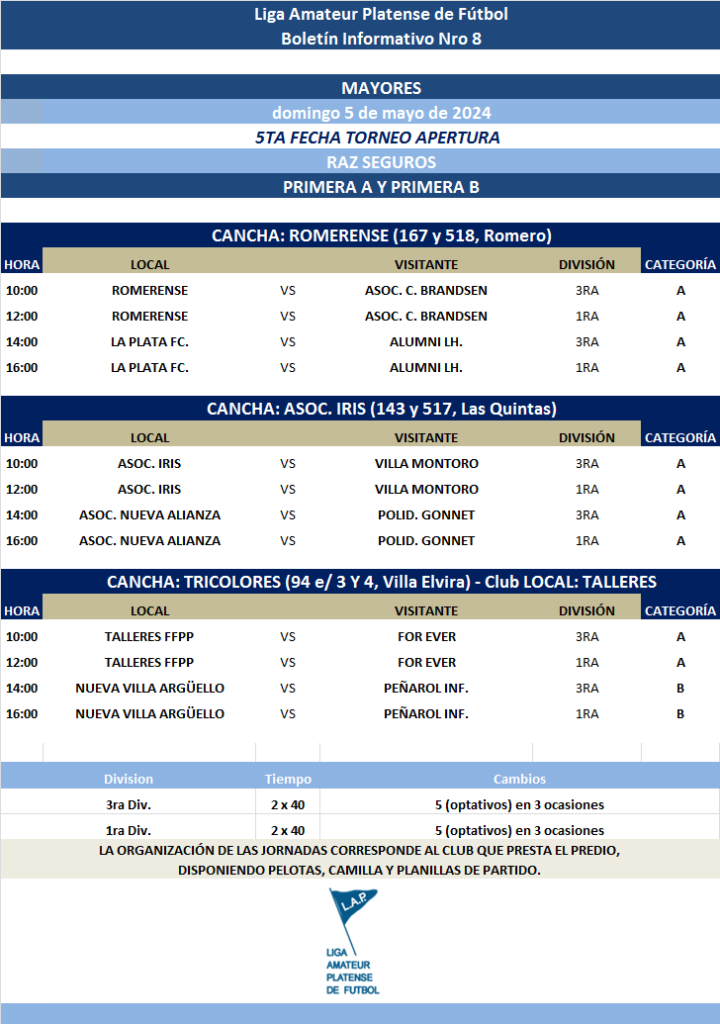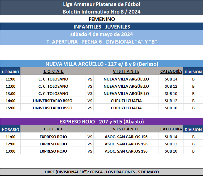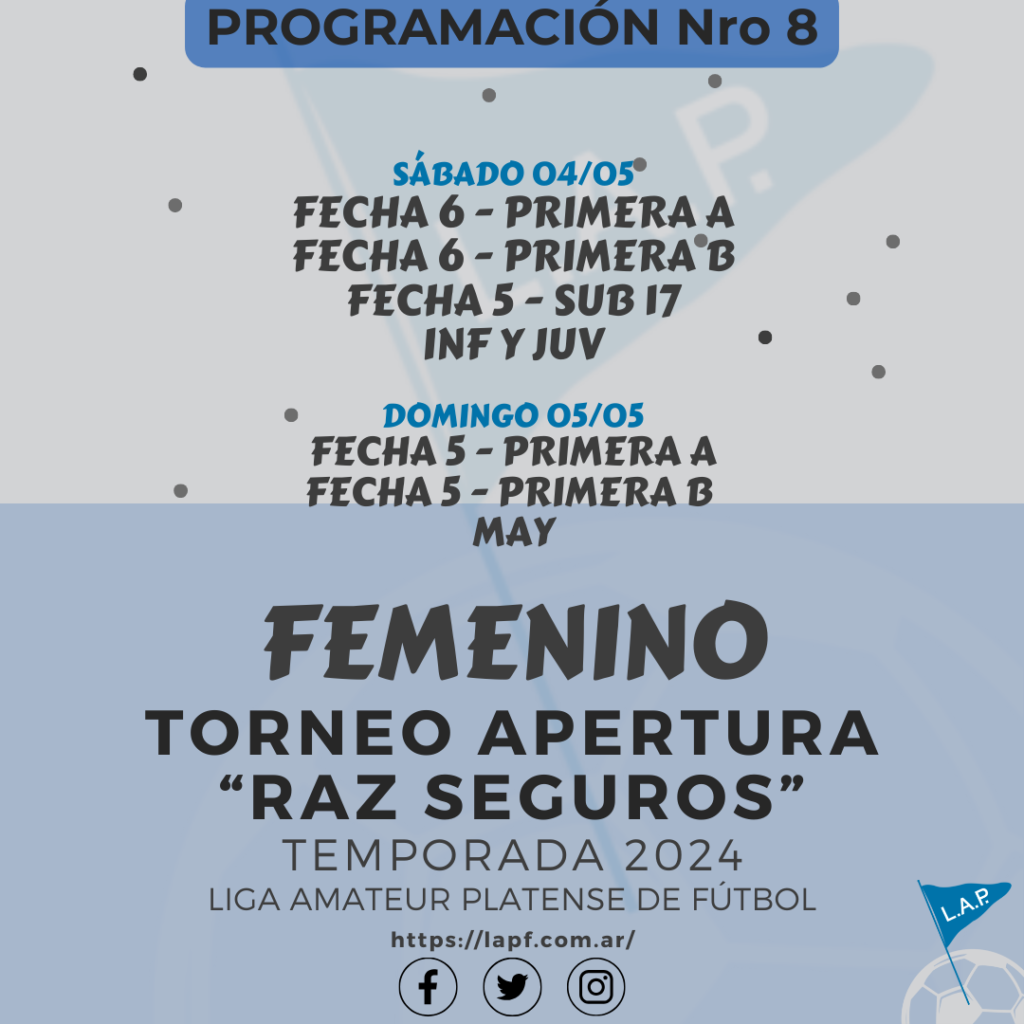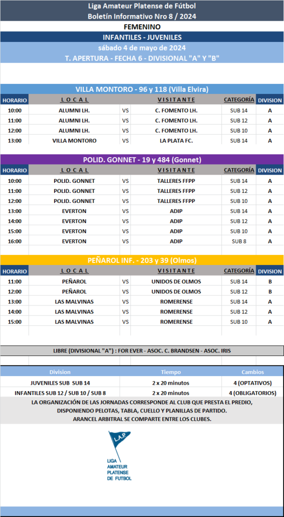 Les comunicamos el boletín informativo con la programación N°8 a disputarse el próximo fin de semana según el siguiente cronograma: