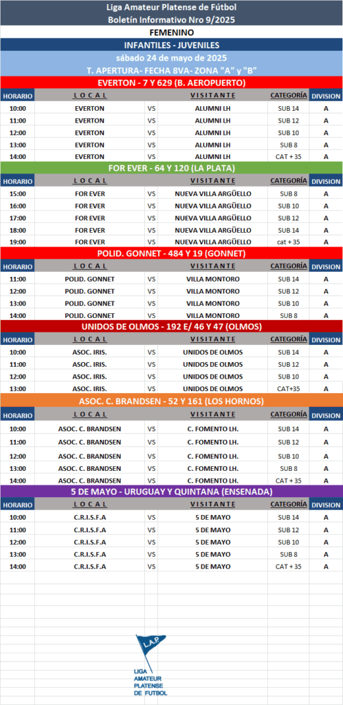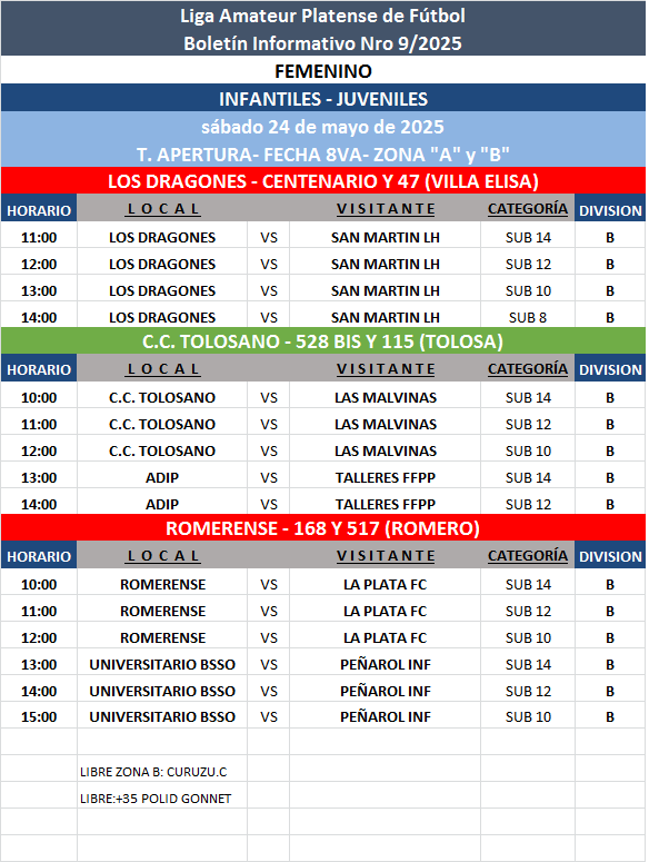 Les comunicamos el boletín informativo con la programación N°9 a disputarse el próximo fin de semana según el siguiente cronograma: