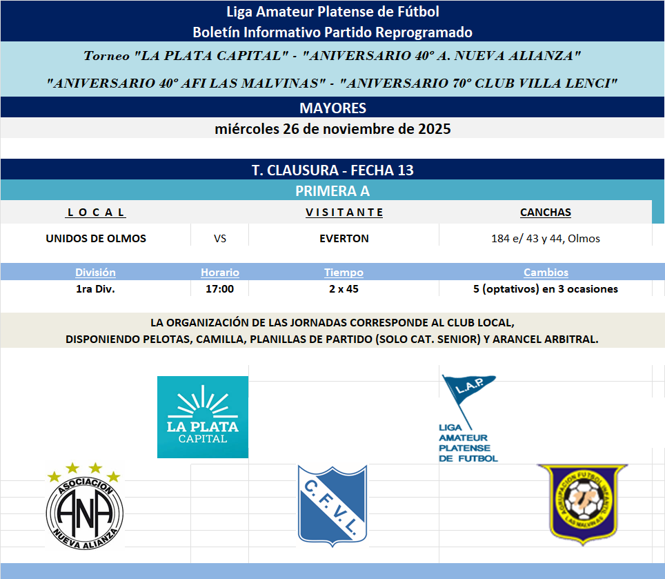 PROGRAMACIÓN REPROGRAMADOS– 2025: T. CLAUSURA LA PLATA CAPITAL – ANIVERSARIO 40 NUEVA ALIANZA – ANIVERSARIO 70 VILLA LENCI – ANIVERSARIO 40 LAS MALVINAS