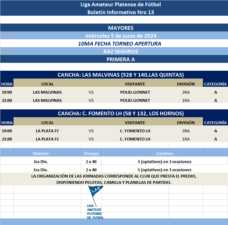 Les comunicamos el boletín informativo con la programación previa fecha 10 a disputarse el próximo miércoles: