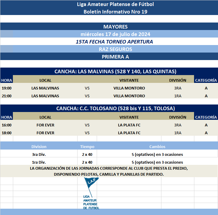 Les comunicamos el boletín informativo con la programación previa fecha 15 a disputarse el próximo miércoles: