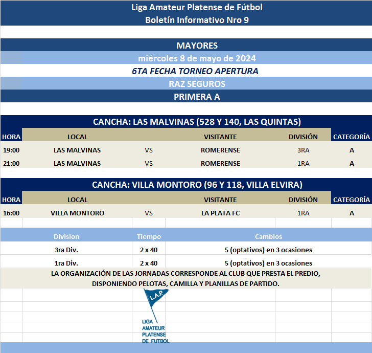 Les comunicamos el boletín informativo con la programación previa fecha 6 a disputarse el próximo miércoles:
