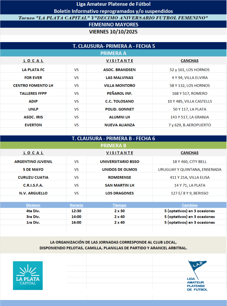 PROGRAMACIÓN REPROGRAMADOS, SUSPENDIDOS Y/O POSTERGADOS – 2025: T. CLAUSURA LA PLATA CAPITAL – DÉCIMO ANIVERSARIO DEL FÚTBOL FEMENINO