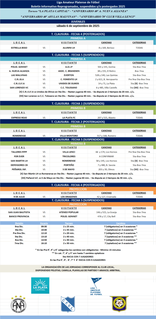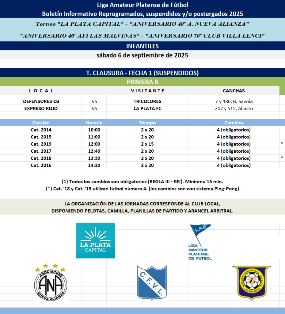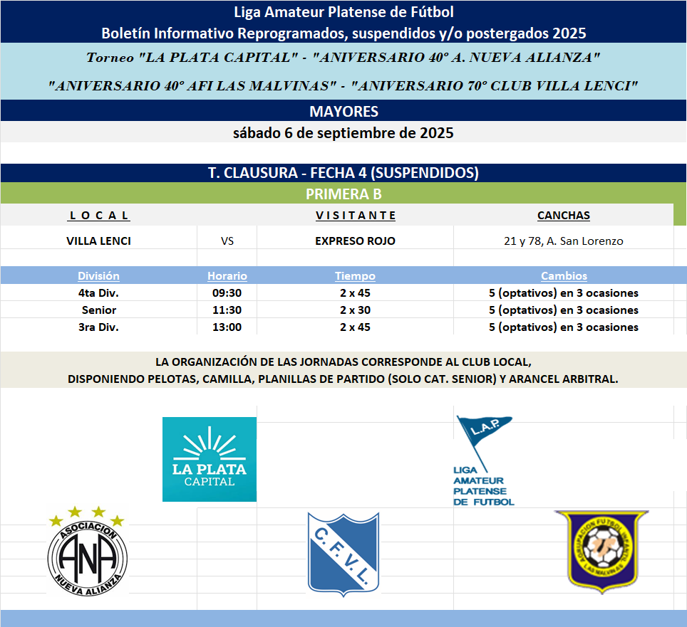 PROGRAMACIÓN REPROGRAMADOS, SUSPENDIDOS Y/O POSTERGADOS – 2025: T. CLAUSURA LA PLATA CAPITAL – ANIVERSARIO 40 NUEVA ALIANZA – ANIVERSARIO 70 VILLA LENCI – ANIVERSARIO 40 LAS MALVINAS