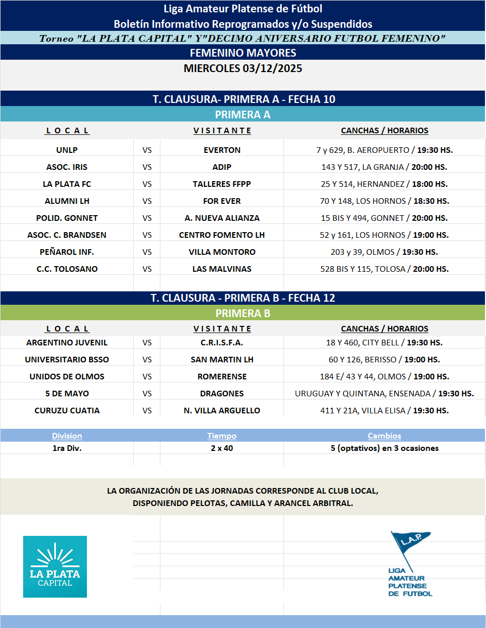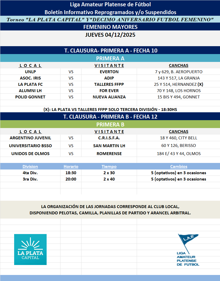 PROGRAMACIÓN REPROGRAMADOS Y/O SUSPENDIDOS – 2025: T. CLAUSURA LA PLATA CAPITAL – DÉCIMO ANIVERSARIO DEL FÚTBOL FEMENINO