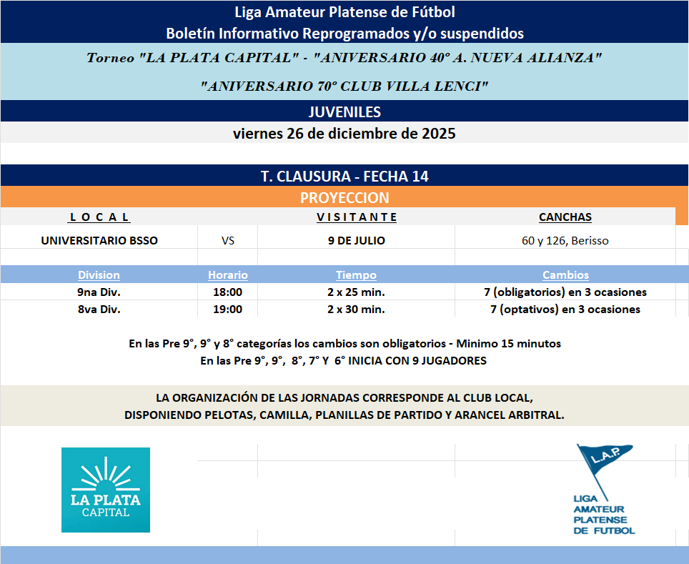 PROGRAMACIÓN REPROGRAMADOS Y/O SUSPENDIDOS – 2025: T. CLAUSURA LA PLATA CAPITAL – ANIVERSARIO 40 NUEVA ALIANZA – ANIVERSARIO 70 VILLA LENCI – ANIVERSARIO 40 LAS MALVINAS