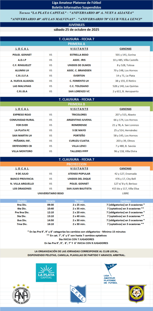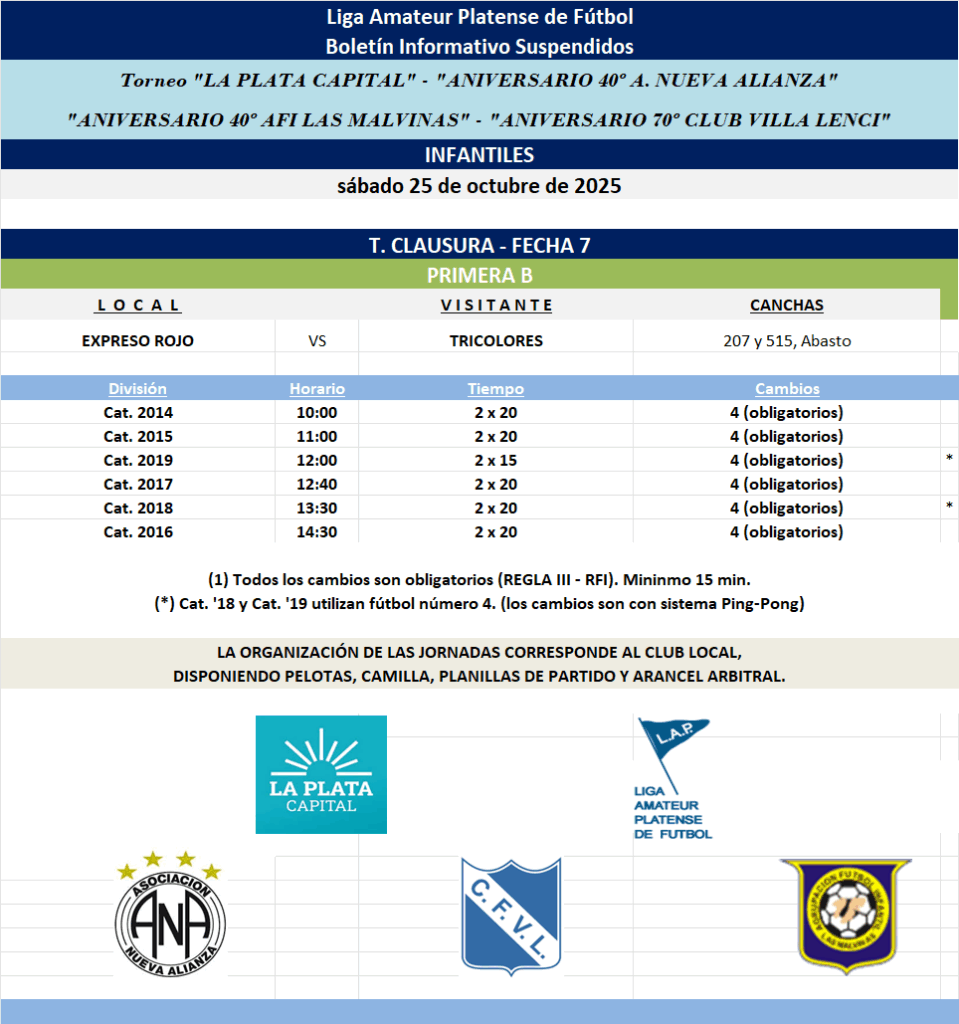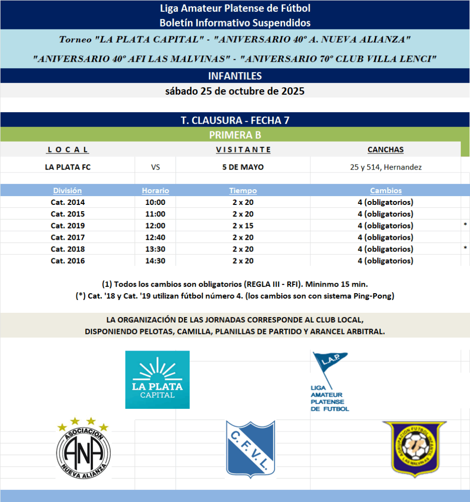 PROGRAMACIÓN SUSPENDIDOS – 2025: T. CLAUSURA LA PLATA CAPITAL – ANIVERSARIO 40 NUEVA ALIANZA – ANIVERSARIO 70 VILLA LENCI – ANIVERSARIO 40 LAS MALVINAS
