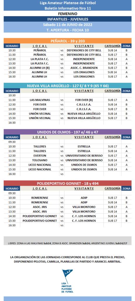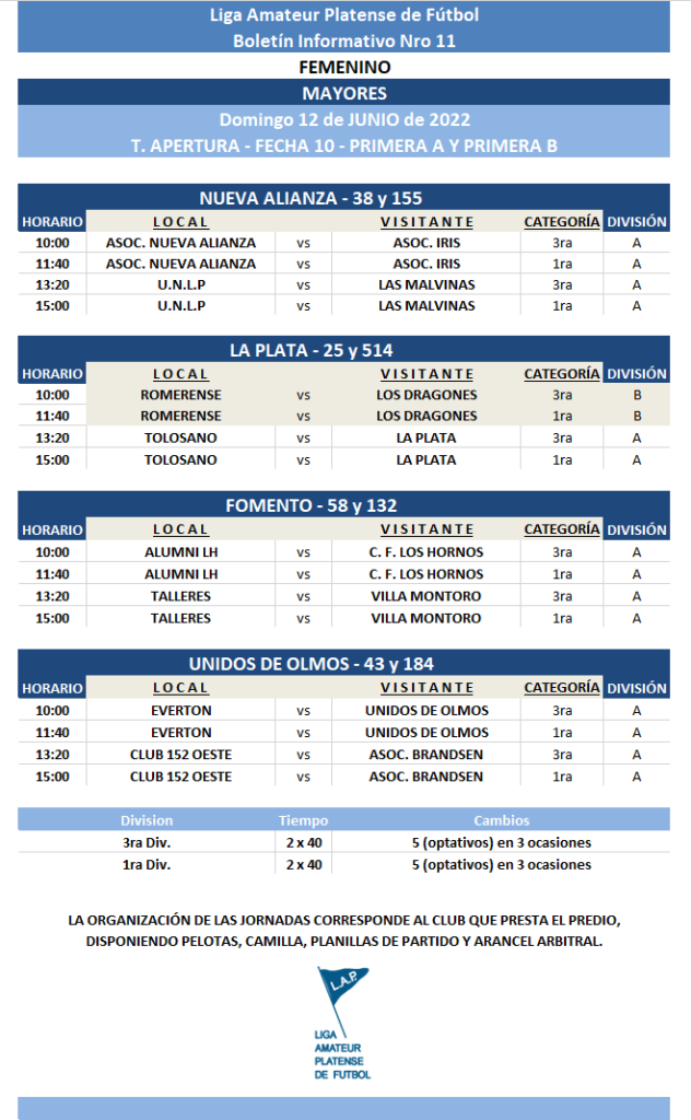 Compartimos la programación prevista para los partidos correspondientes al T. Apertura de Primera Divisional “A” y Primera Divisional “B” de #Femenino de Mayores y Juveniles Sub17 y Sub14 a disputarse el próximo fin de semana.