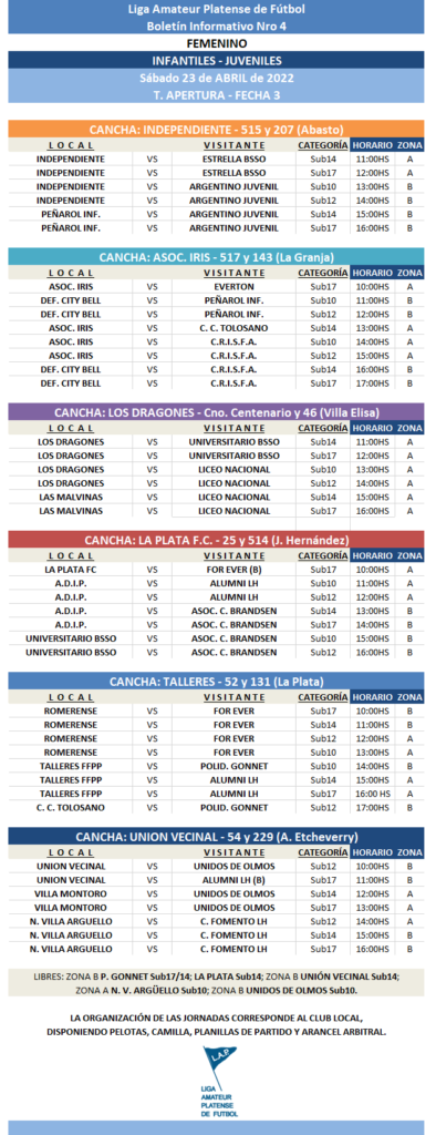 Compartimos la programación prevista para los partidos correspondientes al T. Apertura de Primera Divisional “A” y Primera Divisional “B” de Mayores #Femenino y Juveniles Sub17 y Sub14 e Infantiles Sub12 y Sub10 a disputarse el próximo fin de semana.