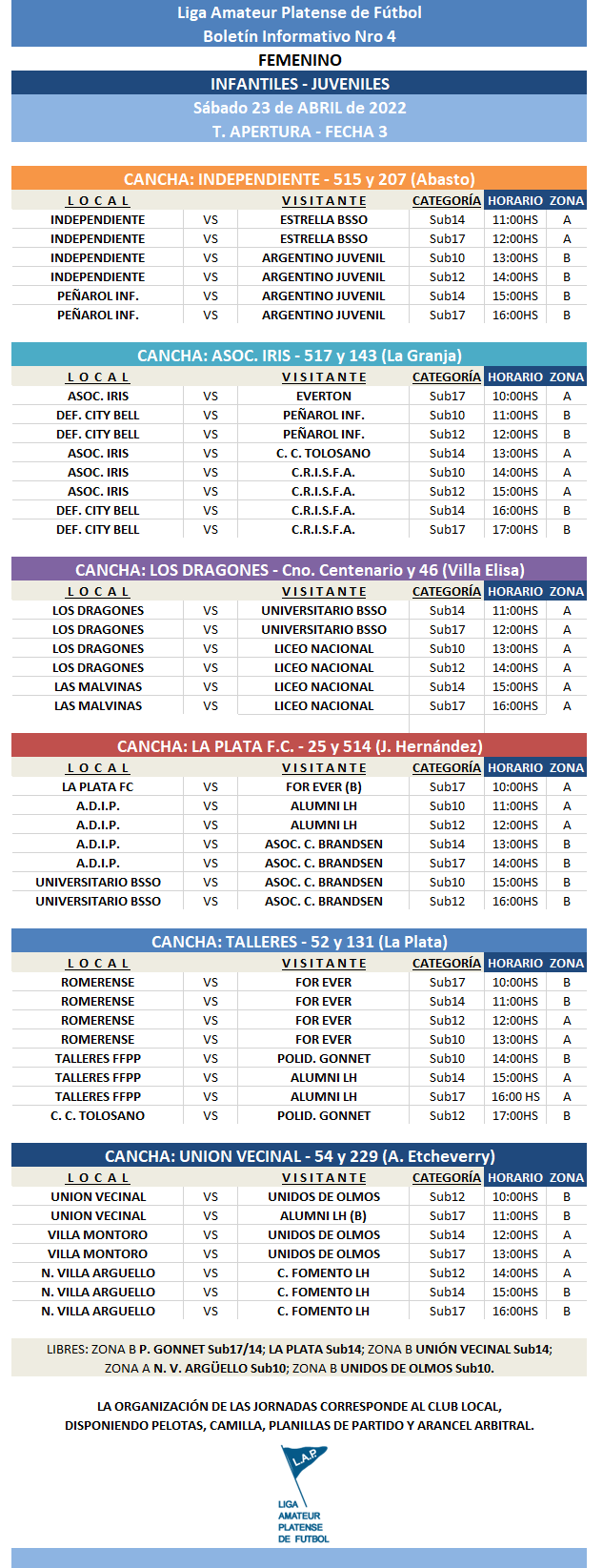 Compartimos la programación prevista para los partidos correspondientes al T. Apertura de Primera Divisional “A” y Primera Divisional “B” de Mayores #Femenino y Juveniles Sub17 y Sub14 e Infantiles Sub12 y Sub10 a disputarse el próximo fin de semana.