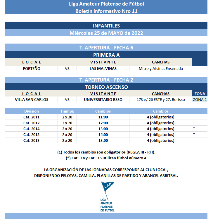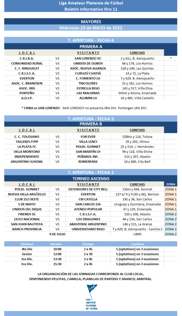 Compartimos la programación para los partidos del T. Apertura de Primera “A”, Primera “B” y Torneo Ascenso de Mayores a disputarse durante el feriado del próximo miércoles 25 de mayo, y también dos jornadas pendientes de Fútbol Infantil.