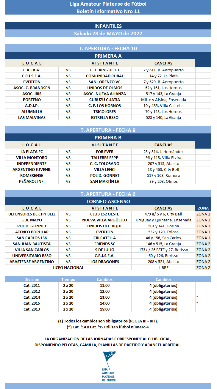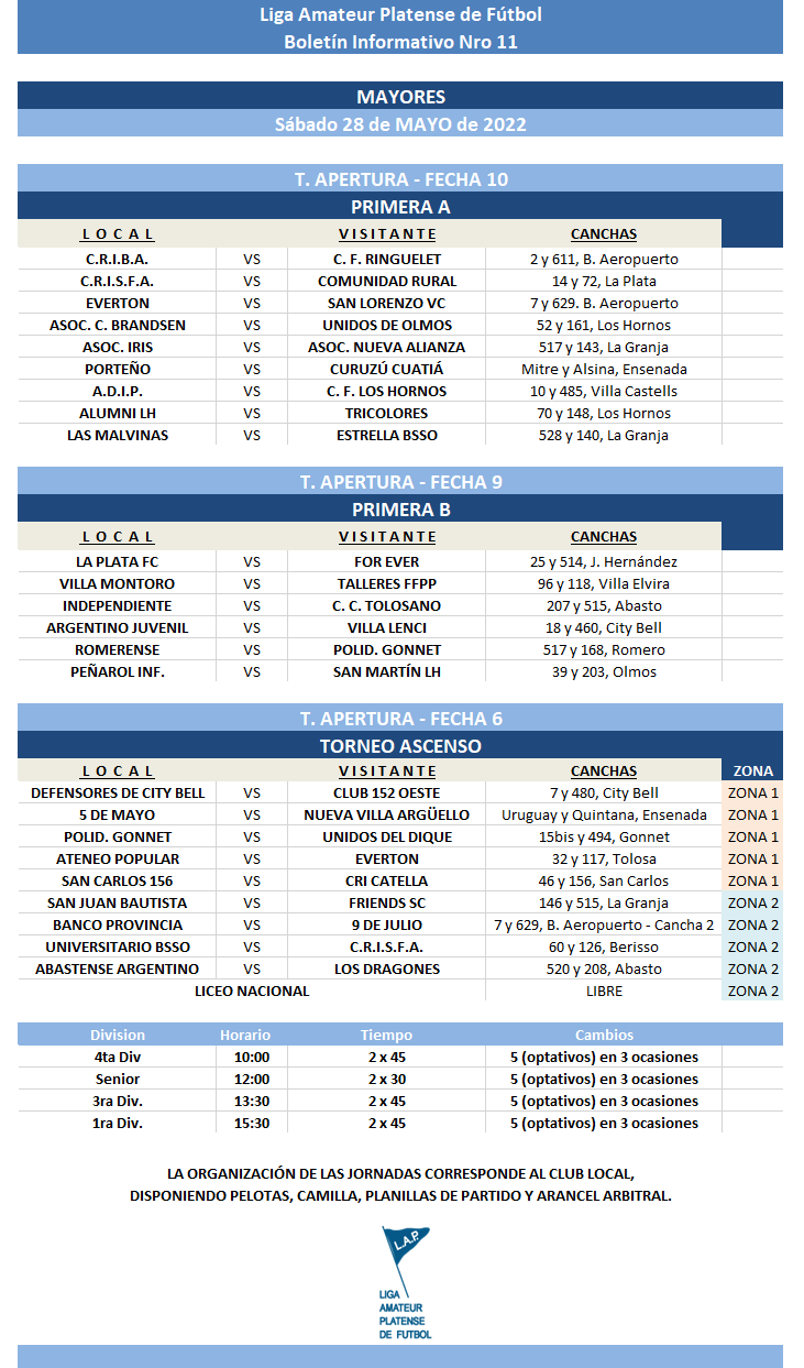 Compartimos la programación para los partidos del T. Apertura de Primera “A”, Primera “B” y Torneo Ascenso de Mayores a disputarse durante el feriado del próximo miércoles 25 de mayo, y también dos jornadas pendientes de Fútbol Infantil.