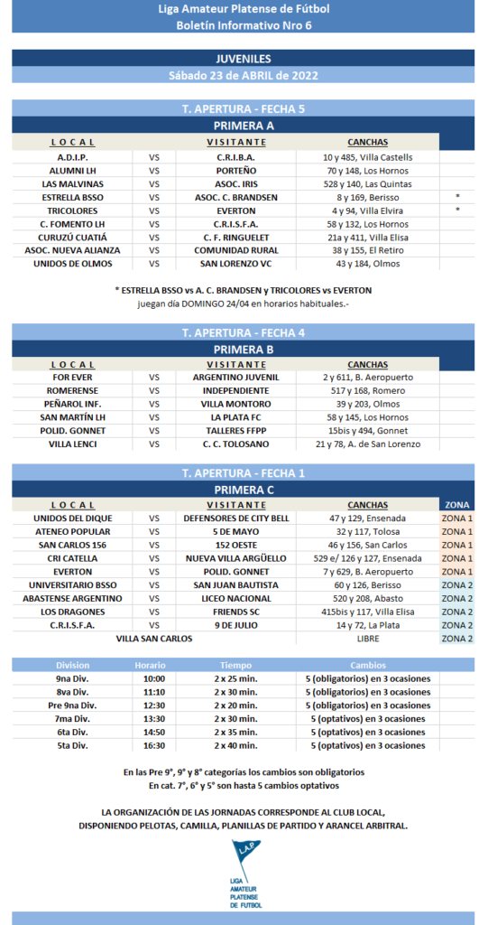 5TA FECHA – PRIMERA A Mayores – Infantiles – Juveniles