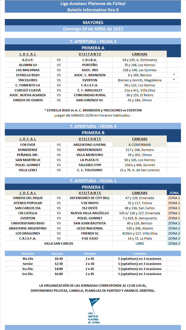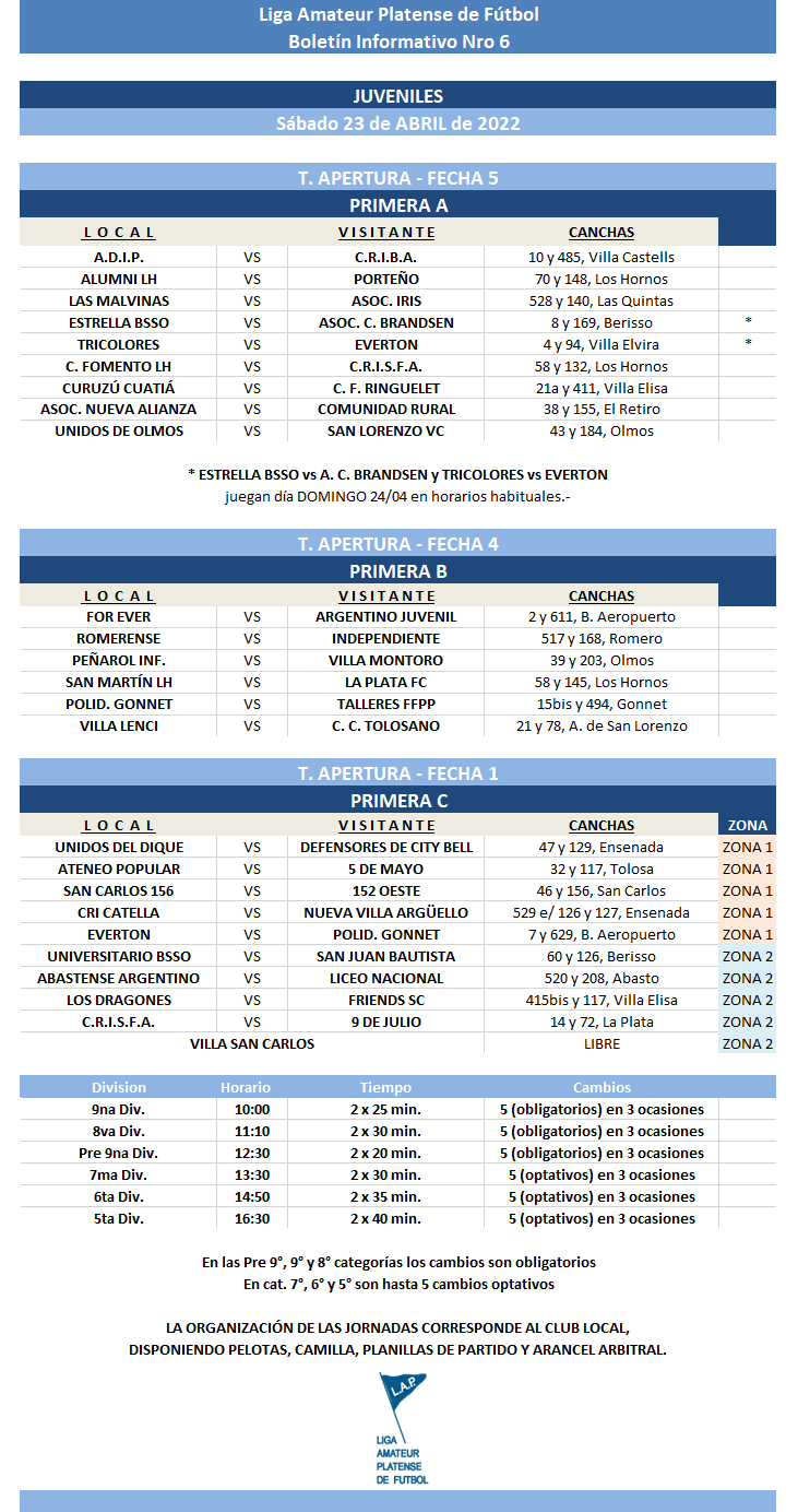 1RA FECHA – PRIMERA C Mayores – Infantiles – Juveniles