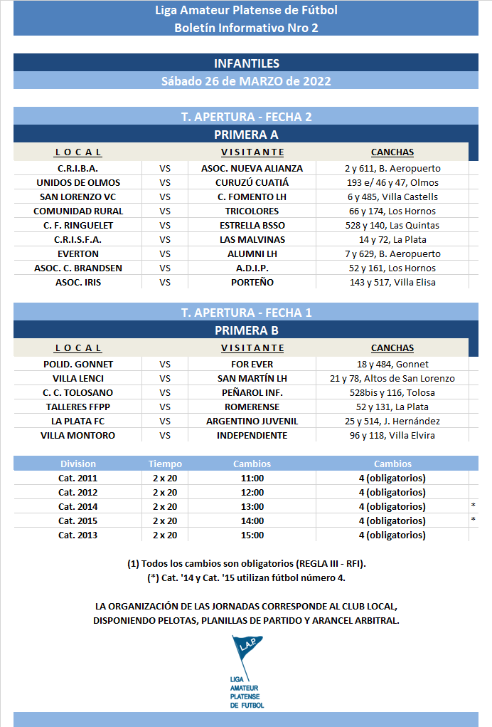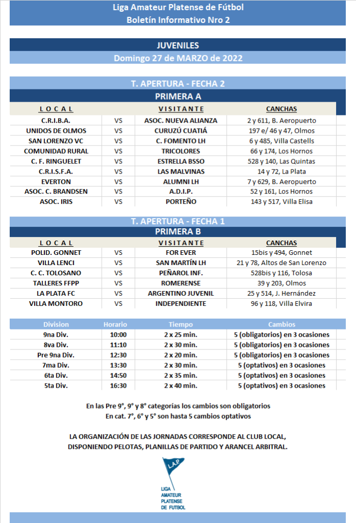 Compartimos la programación prevista para los partidos correspondientes al T. Apertura de Primera Divisional “A” y Primera Divisional “B” de Mayores, Juveniles e Infantiles #Masculino a disputarse el próximo fin de semana.