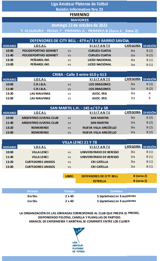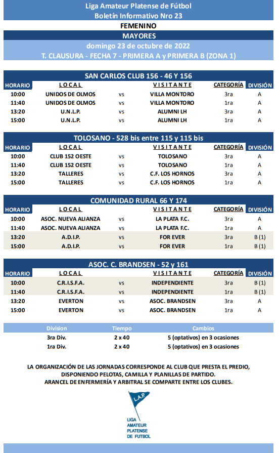 Compartimos la programación para los partidos del T. Clausura de Primera “A” y Primera “B” Zona 1 y Zona 2 de Mayores y Juveniles Sub17 y Sub14 e Infantiles Sub12 y Sub10 a disputarse durante el próximo fin de semana.