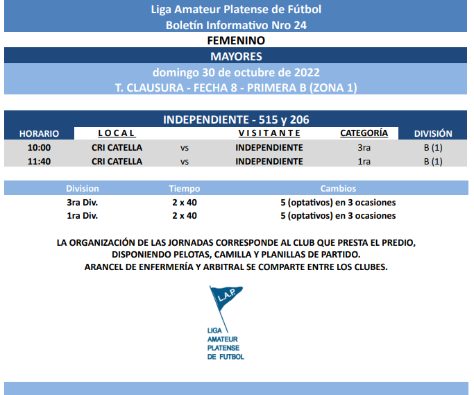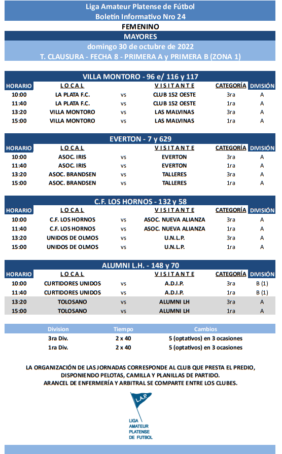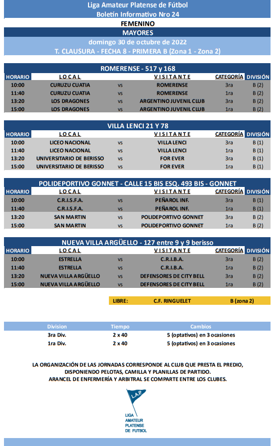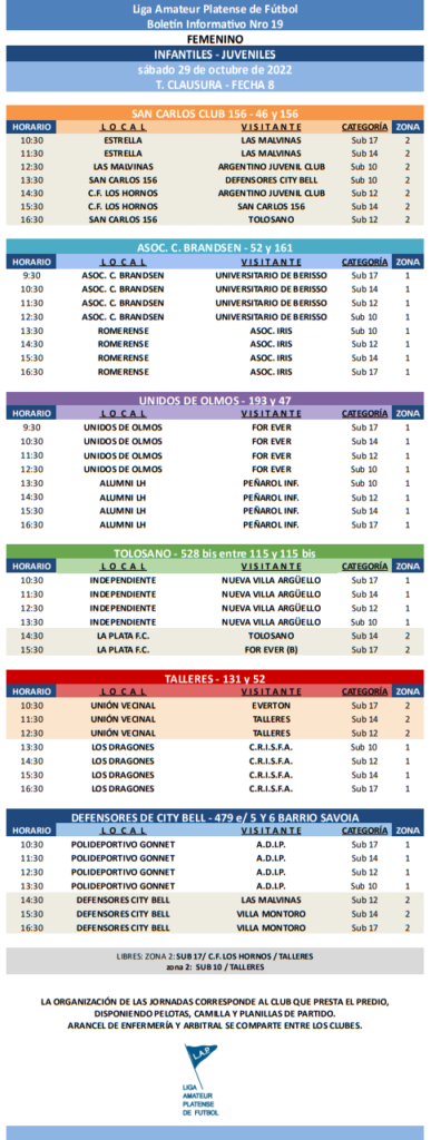 Compartimos la programación para los partidos del T. Clausura de Primera “A” y Primera “B” Zona 1 y Zona 2 de Mayores y Juveniles Sub17 y Sub14 e Infantiles Sub12 y Sub10 a disputarse durante el próximo fin de semana.