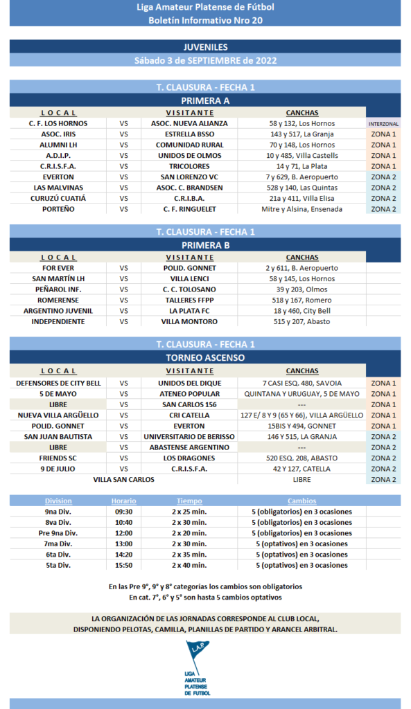 Compartimos la programación para los partidos del T. Clausura de Primera “A”, Primera “B y Torneo Ascenso de Infantiles, Juveniles y Mayores a disputarse durante el próximo fin de semana.