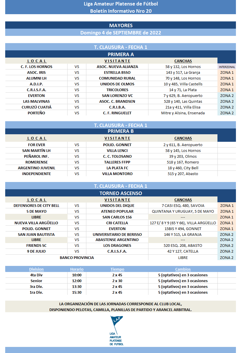 Compartimos la programación para los partidos del T. Clausura de Primera “A”, Primera “B y Torneo Ascenso de Infantiles, Juveniles y Mayores a disputarse durante el próximo fin de semana.