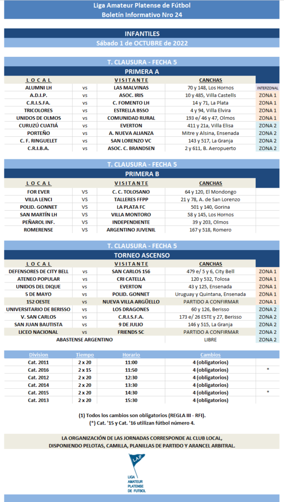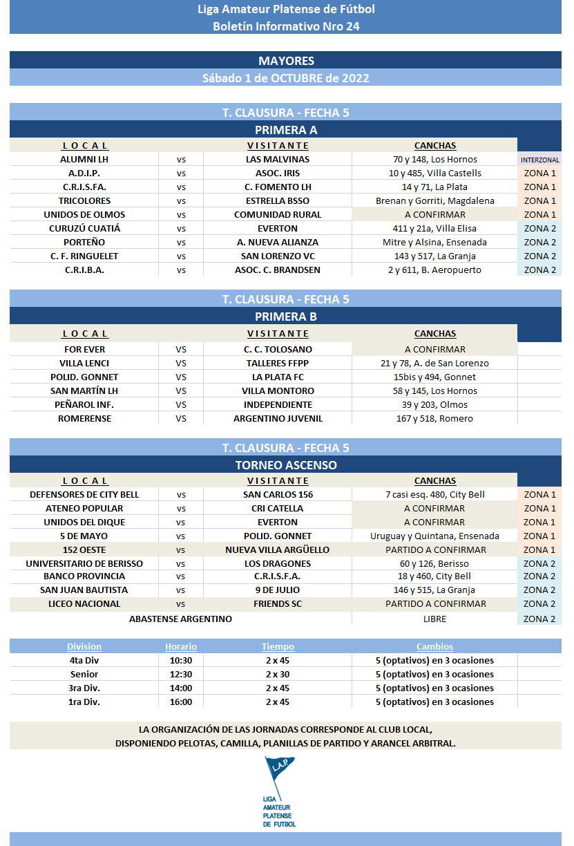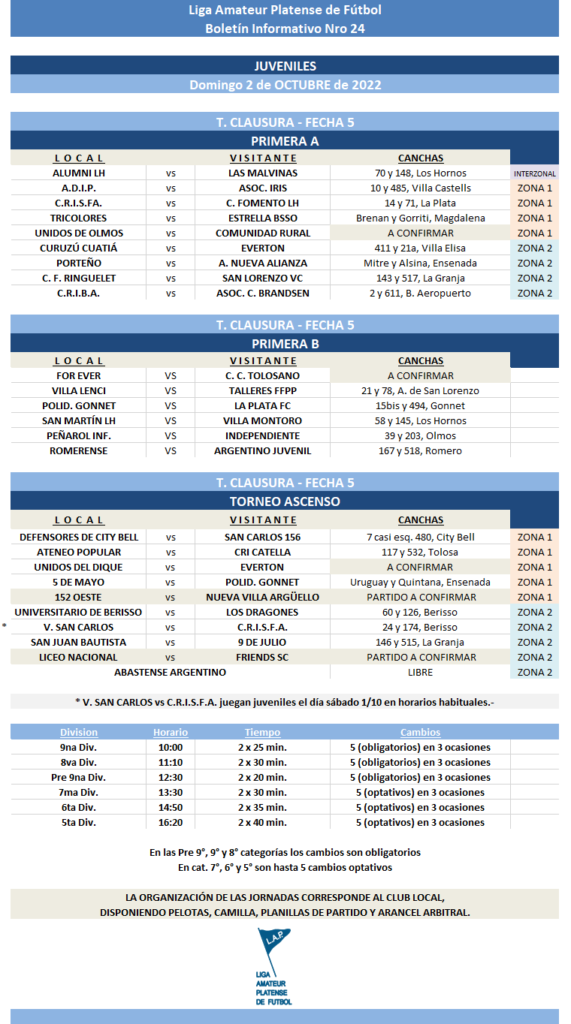 Compartimos la programación para los partidos del T. Clausura de Primera “A”, Primera “B” y Torneo Ascenso de Infantiles, Juveniles y Mayores a disputarse durante el próximo fin de semana.