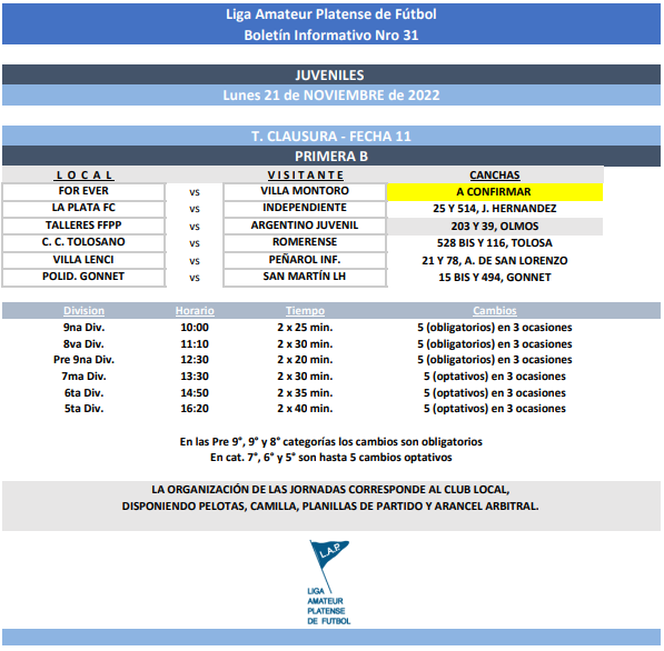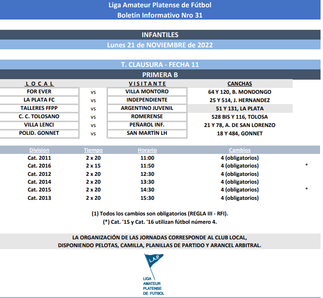 Lunes 21/11 Primera B- T. Clausura 11VA FECHA JUVENILES E INFANTILES