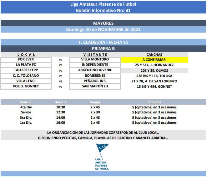 Dom 20/11 Primera B- T. Clausura 11VA FECHA MAYORES