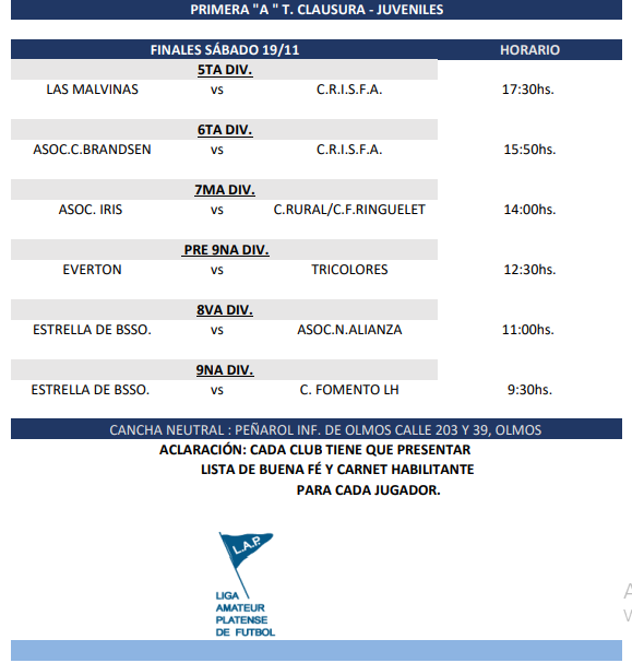 Sáb 19/11 Primera A – T. Clausura FINALES JUVENILES