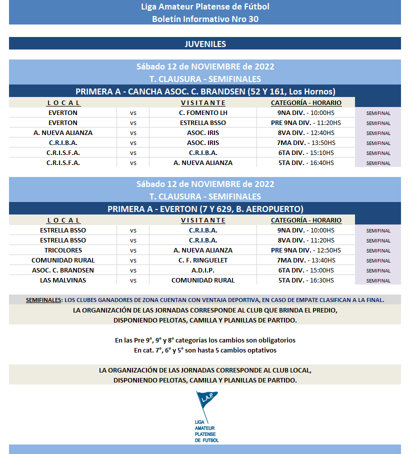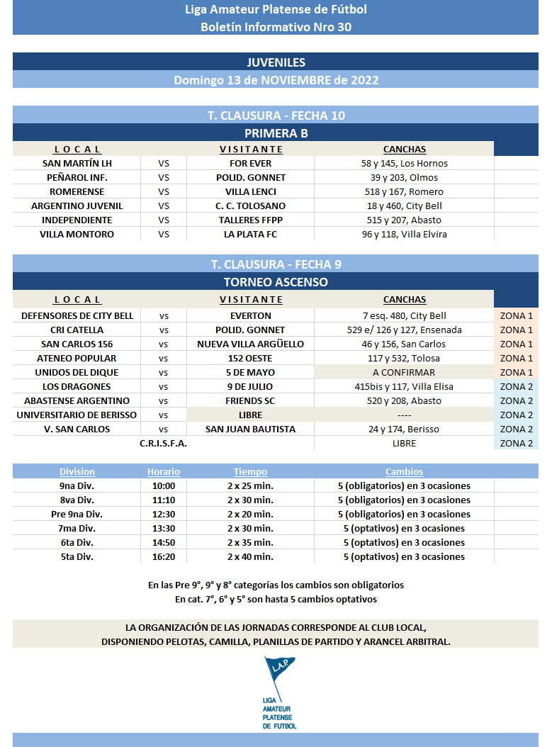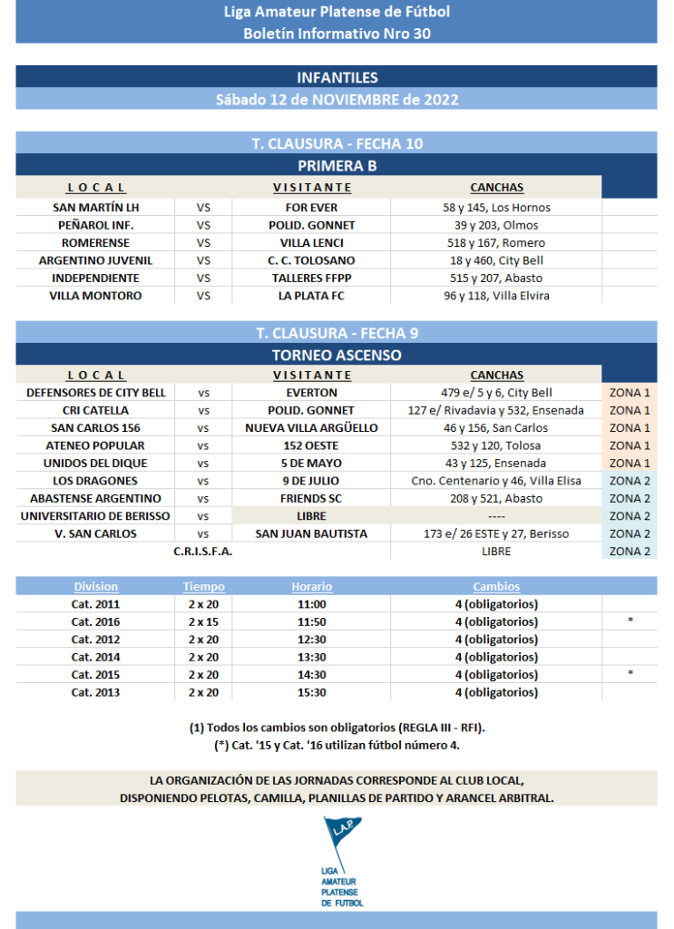 Compartimos la programación para los partidos del T. Clausura de Primera “A” y Torneo Ascenso de Infantiles, Juveniles y Mayores a disputarse durante el próximo fin de semana.