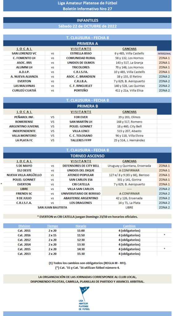 Sábado 22/10: 8VA FECHA – PRIMERA A, PRIMERA B Y T. ASCENSO Infantiles y Mayores