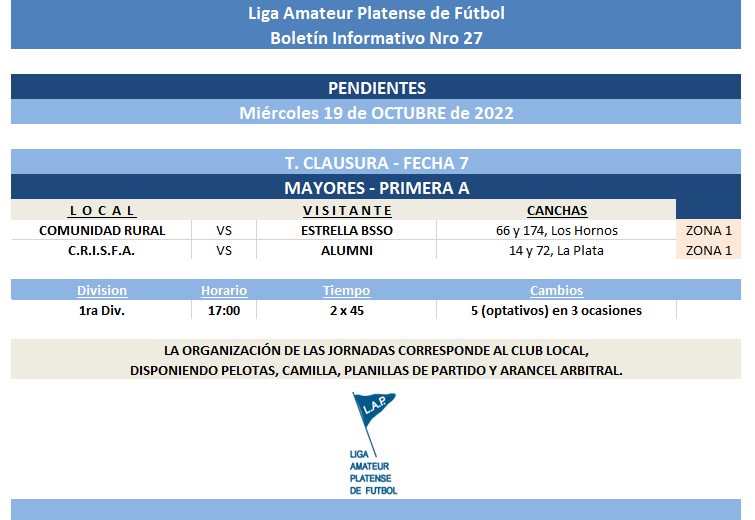 Miércoles 19/10: PENDIENTES – PRIMERA A Mayores