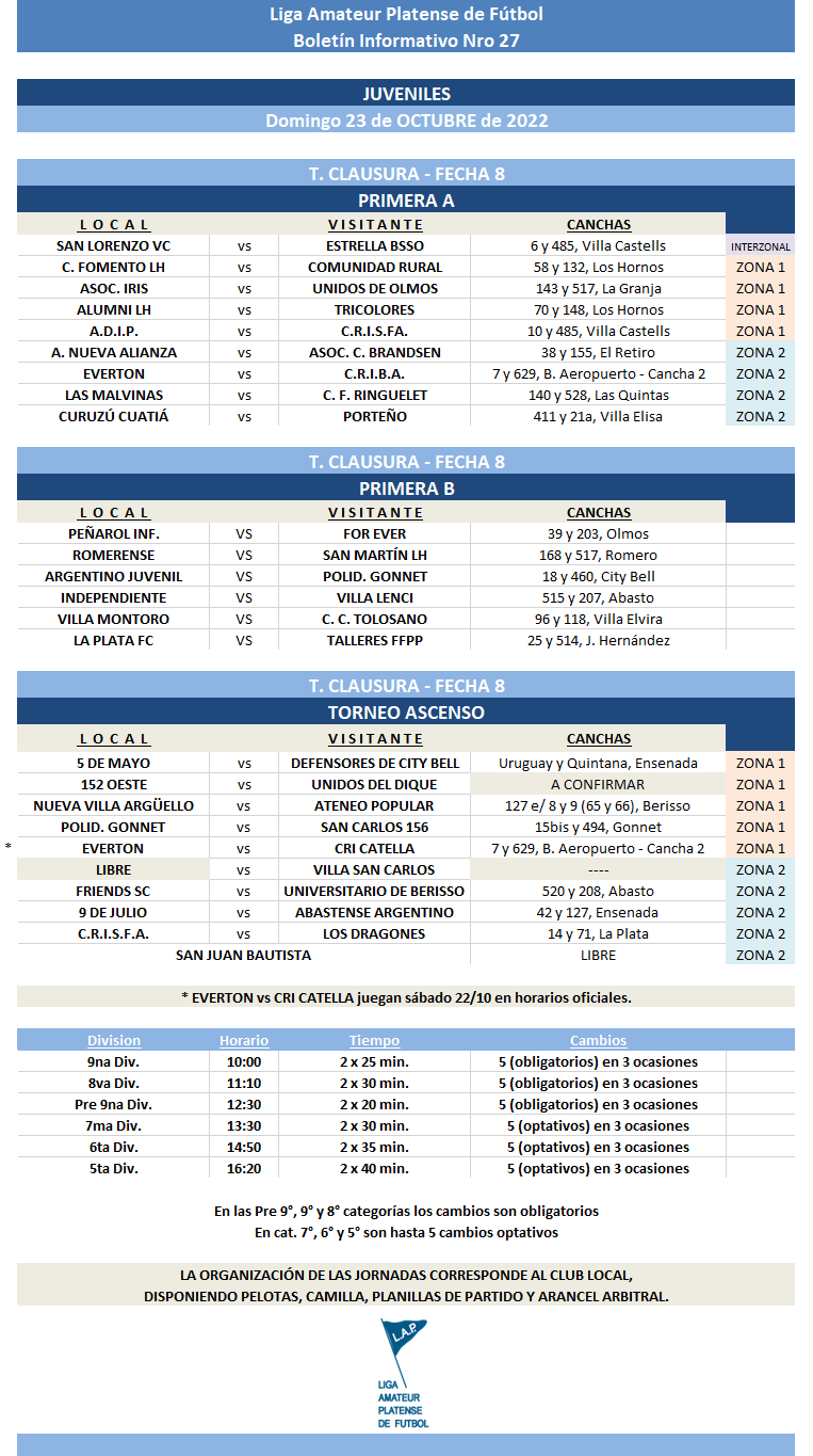 Domingo 23/10: 8VA FECHA – PRIMERA A, PRIMERA B Y T. ASCENSO Juveniles