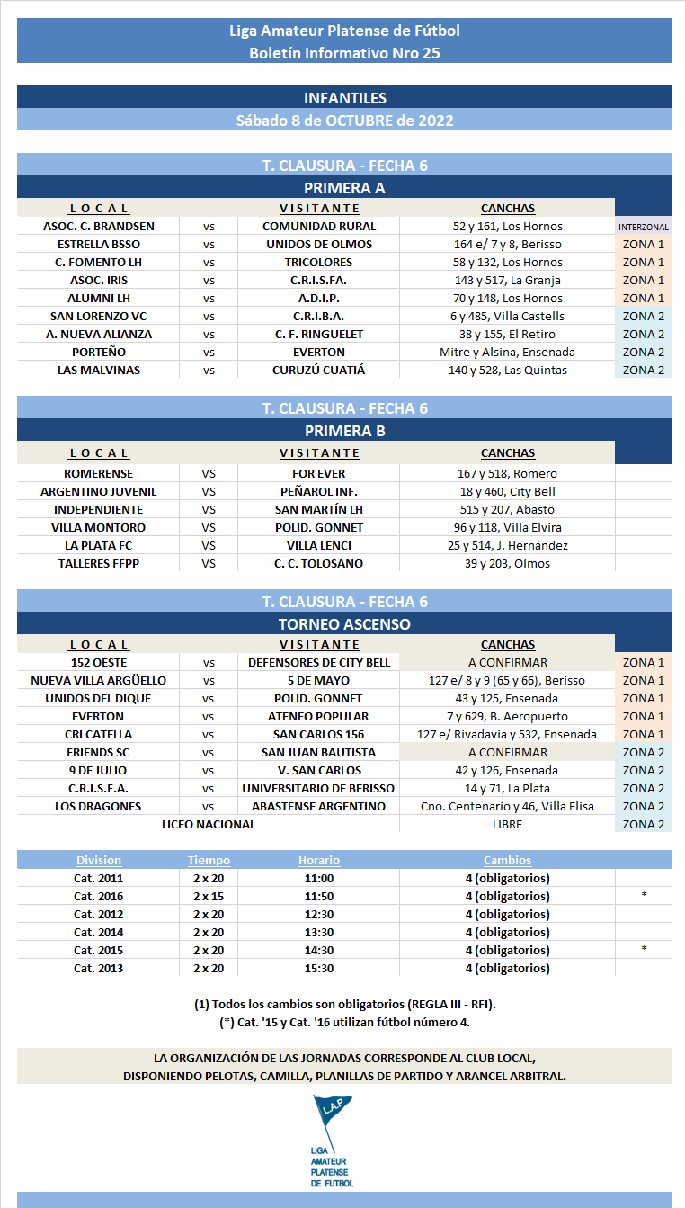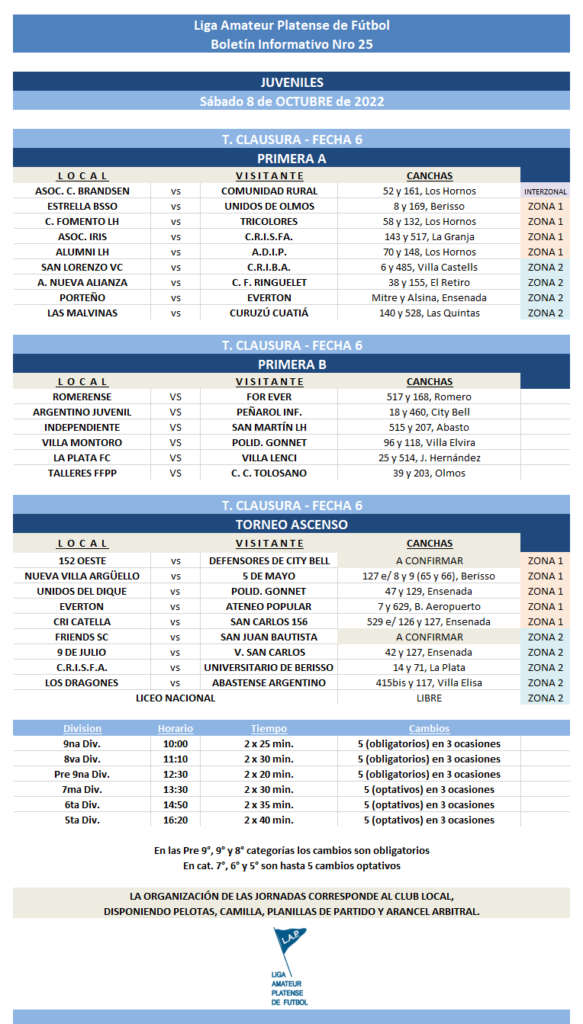 Sábado 8/10: 6TA FECHA – PRIMERA A, PRIMERA B Y T. ASCENSO Infantiles – Juveniles