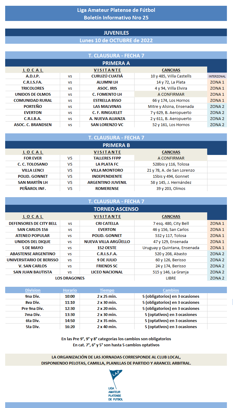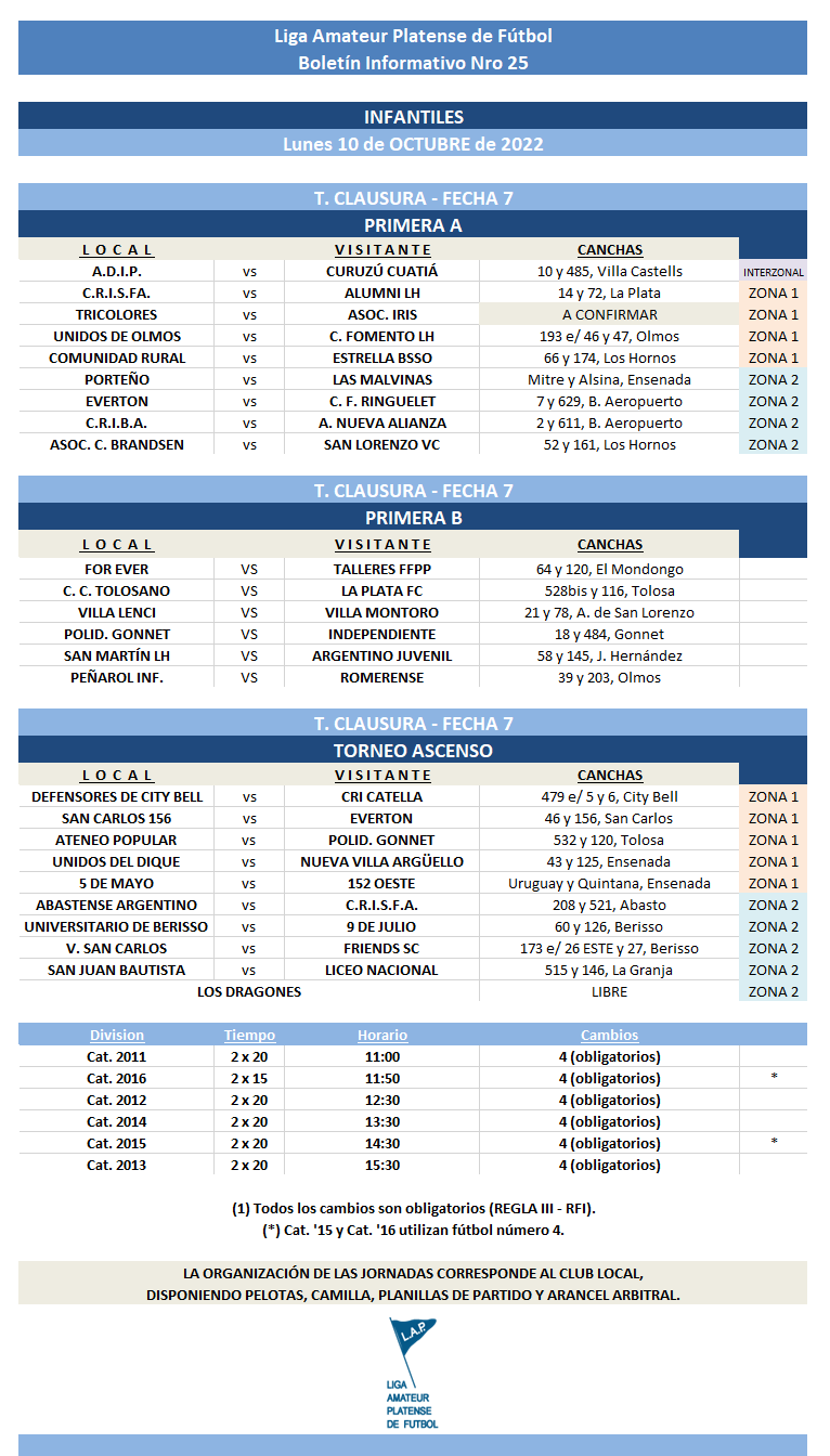 Lunes 10/10: 7MA FECHA – PRIMERA A, PRIMERA B Y T. ASCENSO Infantiles – Juveniles