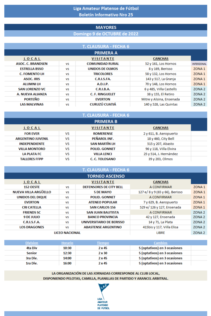 Domingo 9/10: 6TA FECHA – PRIMERA A, PRIMERA B Y T. ASCENSO Mayores