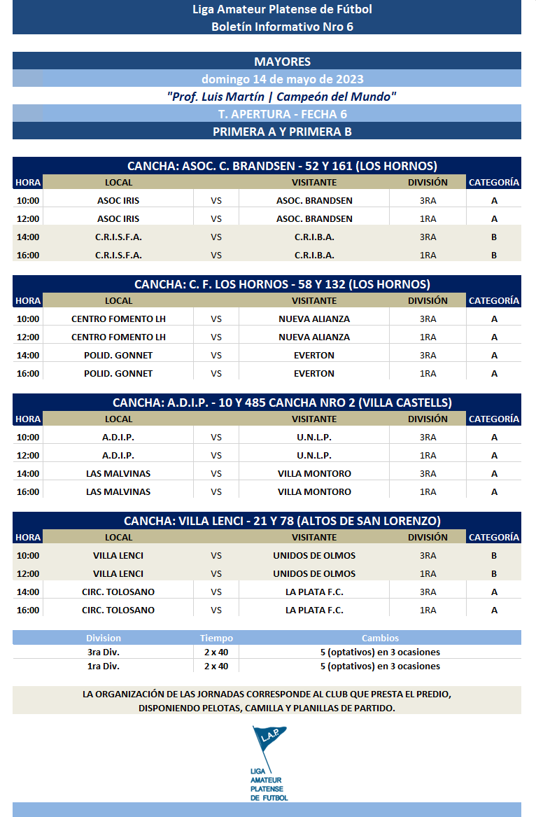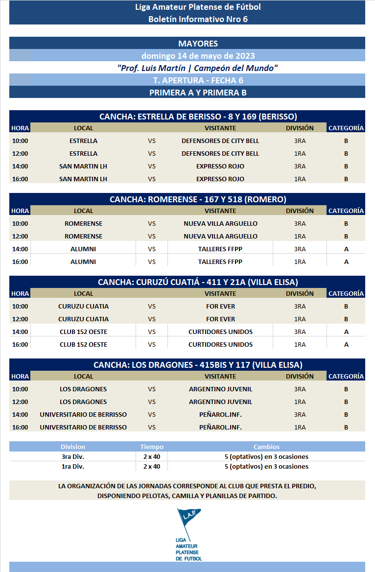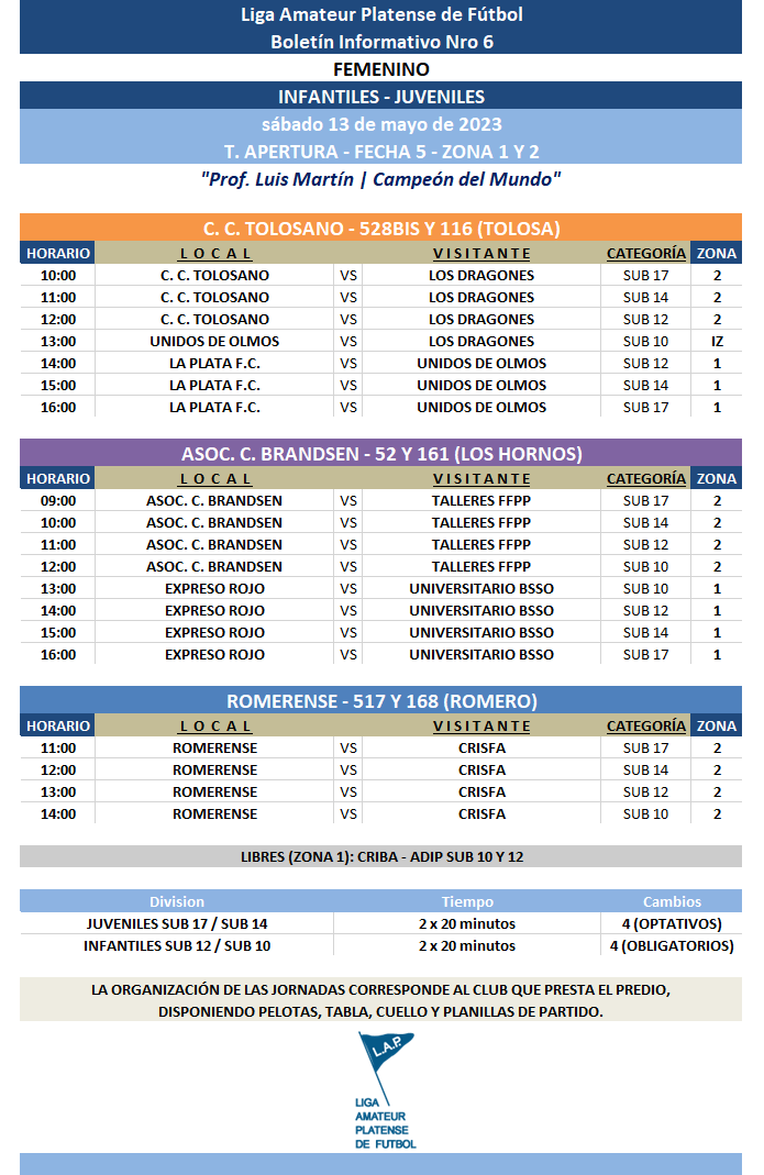 Compartimos la programación de partidos correspondientes a la FECHA 6 del T. Apertura de Primera Divisional A y de Primera Divisional B de Fútbol Femenino “Prof. Luis Martín | Campeón del Mundo” y a la FECHA 5 del campeonato Apertura de Juveniles Sub 17 y Sub 14 e Infantiles Sub 12 y Sub 10 de la Zona 1 y de la Zona 2 a disputarse el próximo fin de semana.