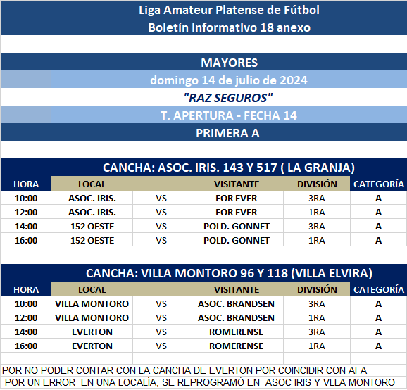El Depto. de Fútbol Femenino notifica que las jornadas de MAYORES entre ASOC. IRIS vs FOR EVER, 152 OESTE vs POLID. GONNET, VILLA MONTORO VS ASOC.C.BRANDSEN y EVERTON vs ROMERENSE correspondiente a la FECHA 14 de la PRIMERA A T.APERTURA “RAZ Seguros” se disputarán en las siguientes CANCHAS y HORARIOS: