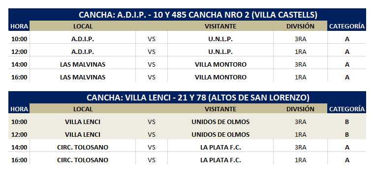 Los partidos previstos en cancha de AFI LAS MALVINAS se reprogramaron en nuevos escenarios, habilitándose el predio de ADIP CANCHA NRO 2 y modificando los cotejos dispuestos en las instalaciones de VILLA LENCI. A continuación, se acompaña la imagen con el detalle de los paridos que fueron corregidos.